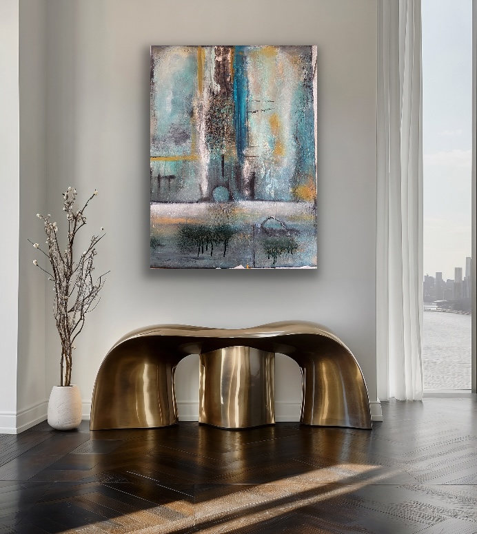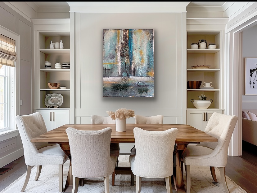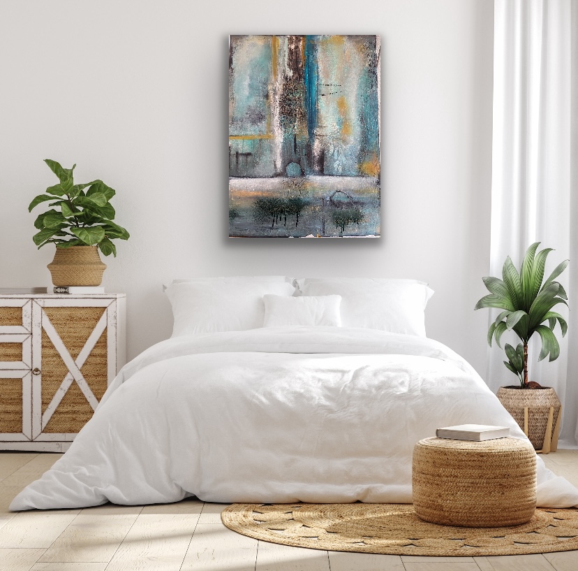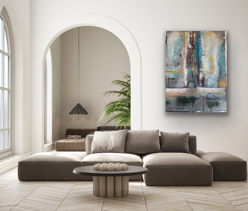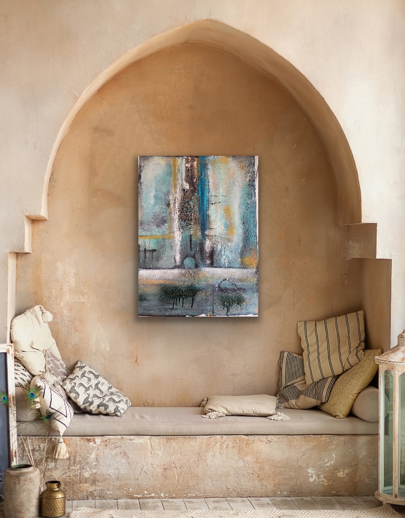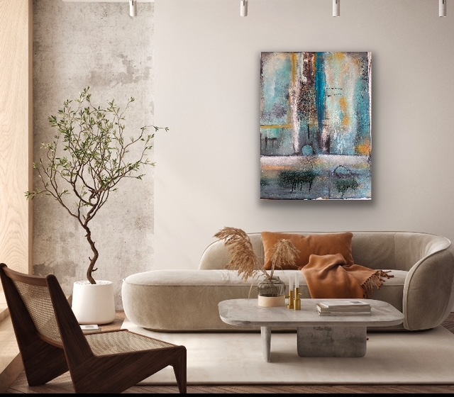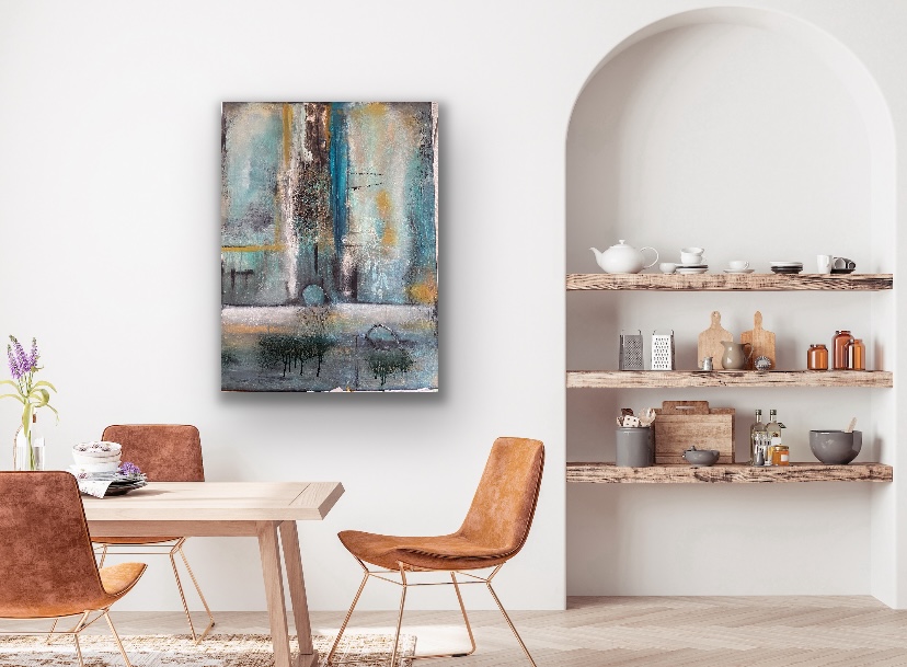 Unikt maleri med spændende detaljer. Måler 60 x 80 cm,